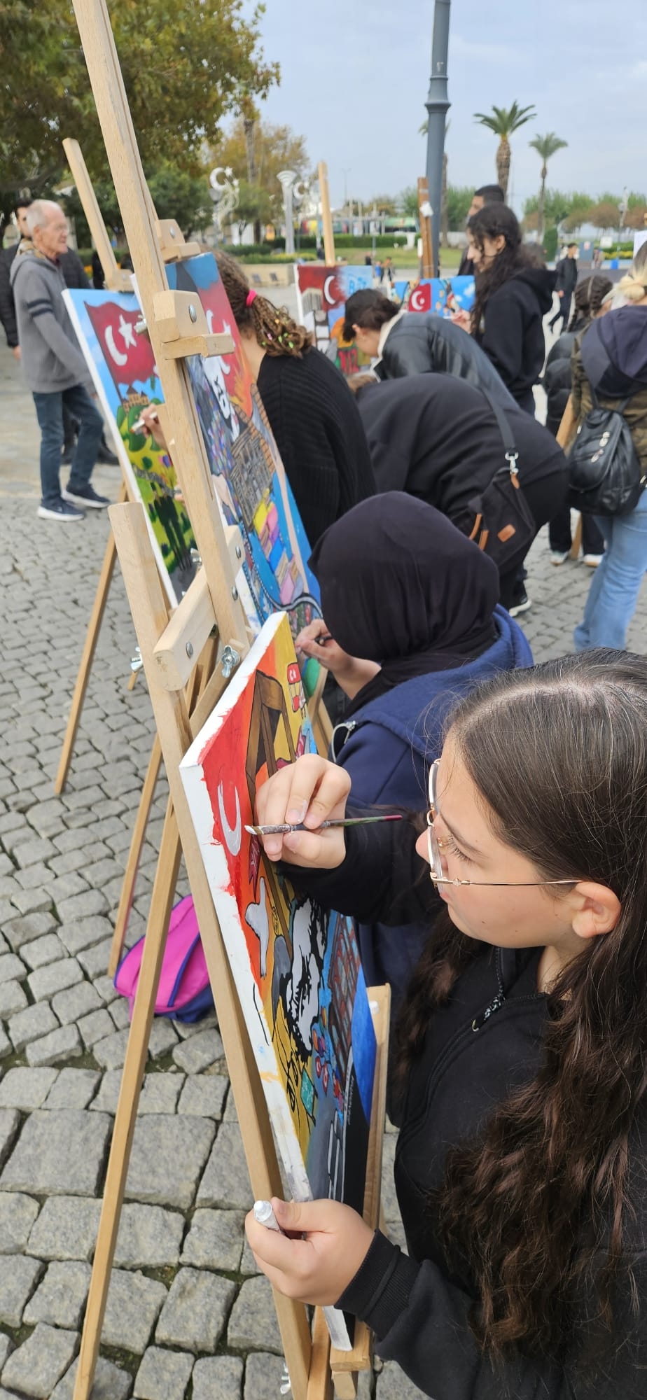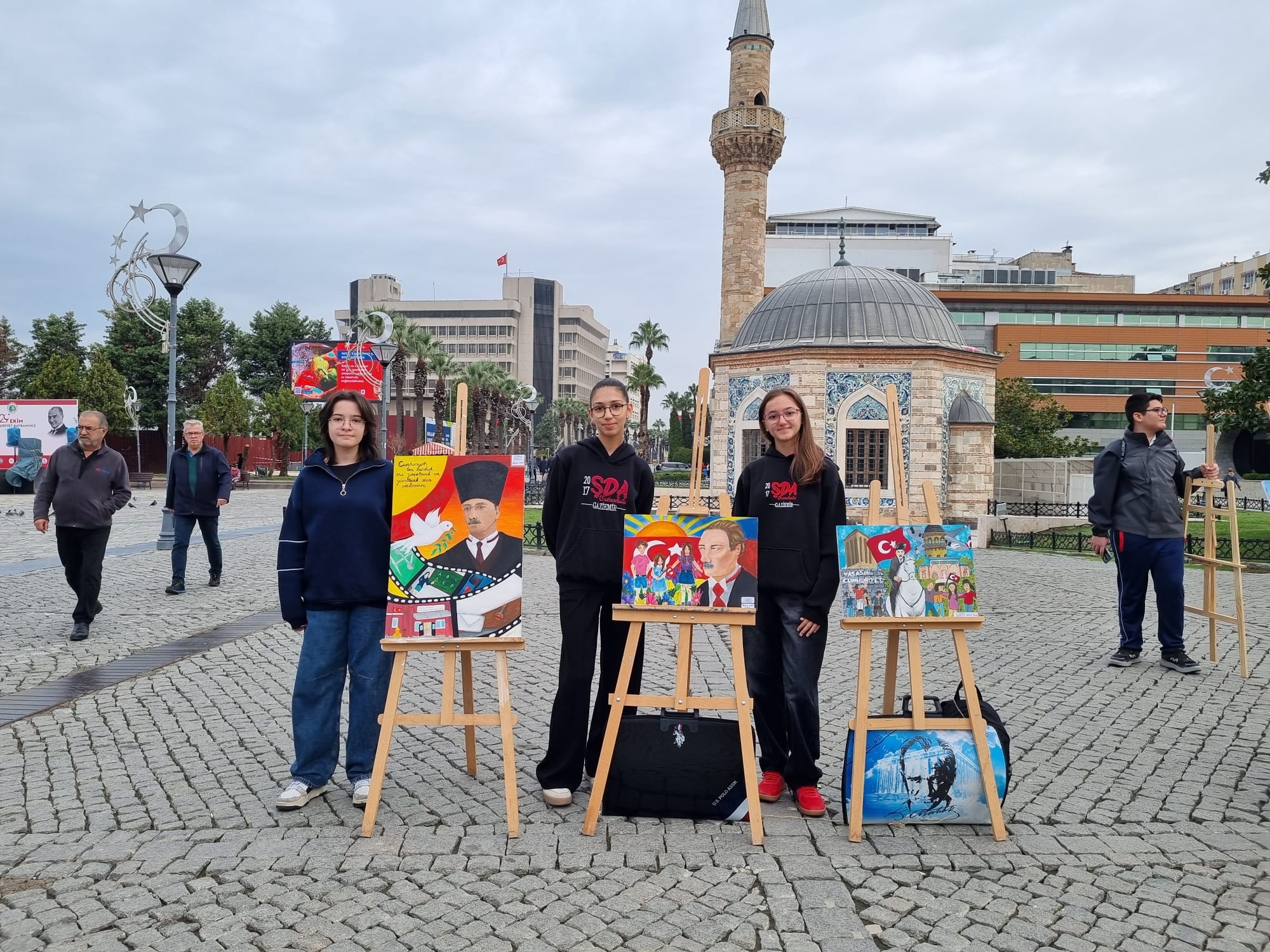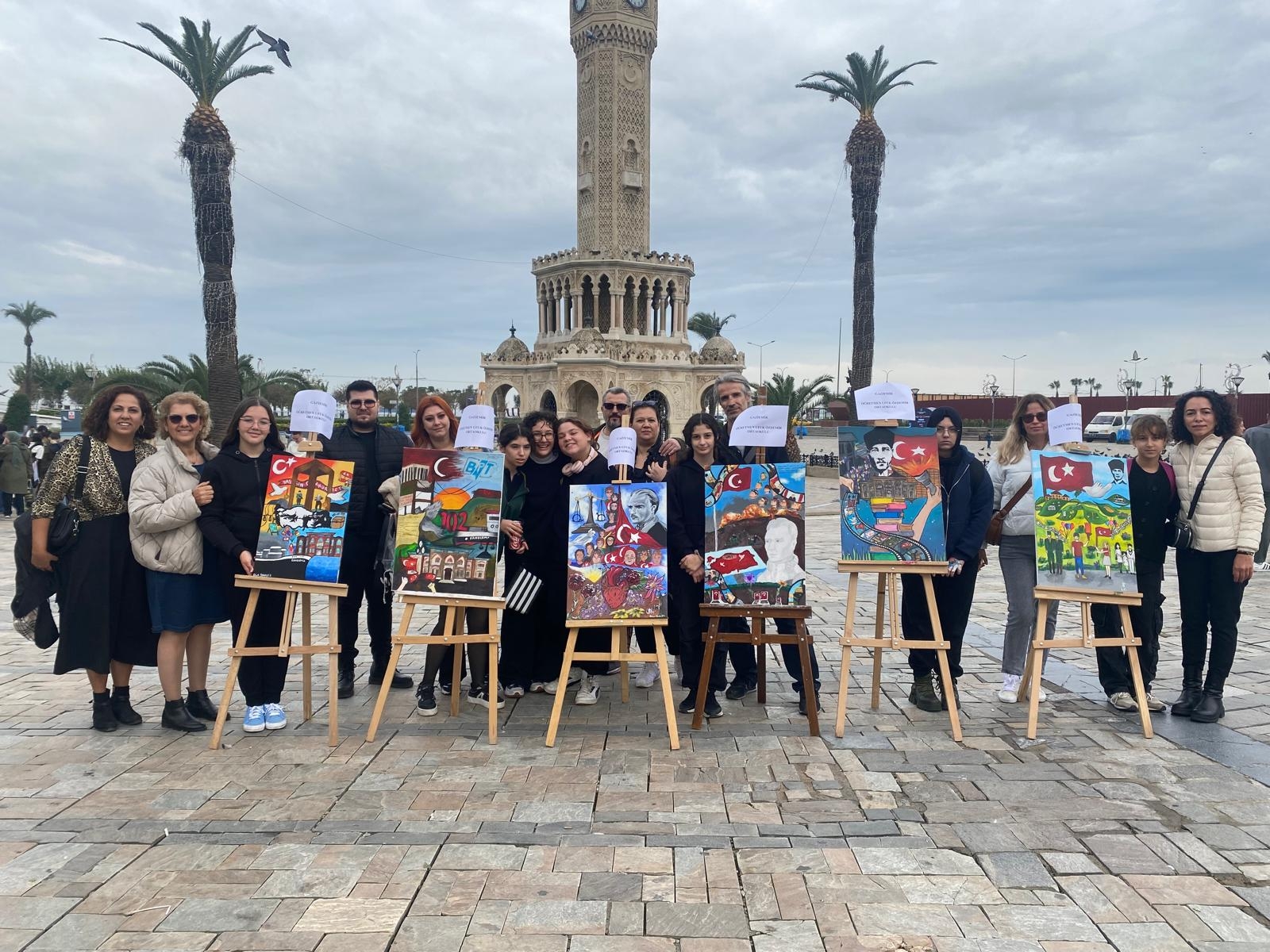 Konak Atatürk Meydanı'nda yapılan resim sergisine katılım yoğundu. İlçemizden Öğretmen Ufuk Özdemir Ortaokulu, Şehit Dursun Acar Ortaokulu ve Şehit Er Selahattin Şener Anadolu İmam Hatip Lisesi öğrencilerimizin, Cumhuriyet temalı canlı performans resim sergisi büyük beğeni topladı.