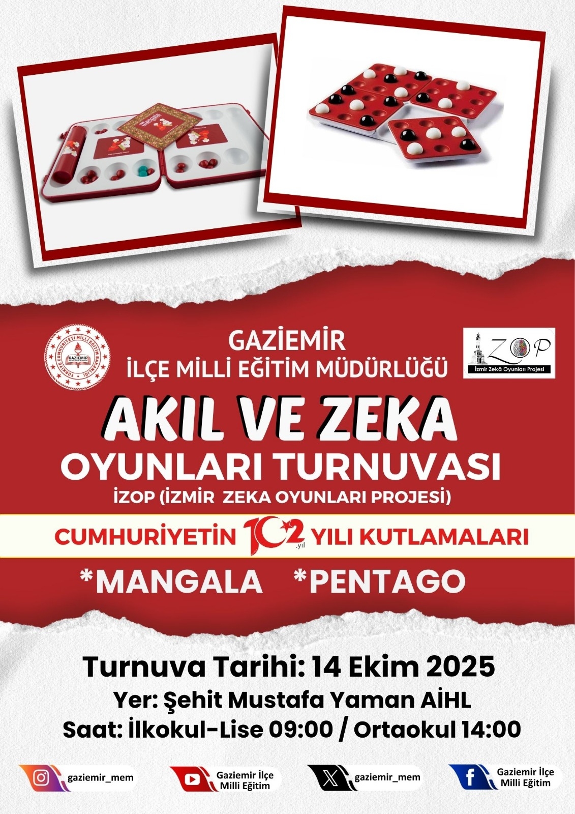 İzmir Zeka Oyunları (İzop) Gaziemir İlçe Turnuvası, 14 Ekim Salı İlkokul (3. ve 4. sınıf öğrencileri) ve Lise (Hazırlık,9, 10, 11. ve 12 sınıf öğrencileri) saat 09.00, Ortaokul (5, 6, 7 ve 8. sınıf öğrencileri) saat 13.30'da Şehit Mustafa Yaman AİHL.'nde yapılacaktır.